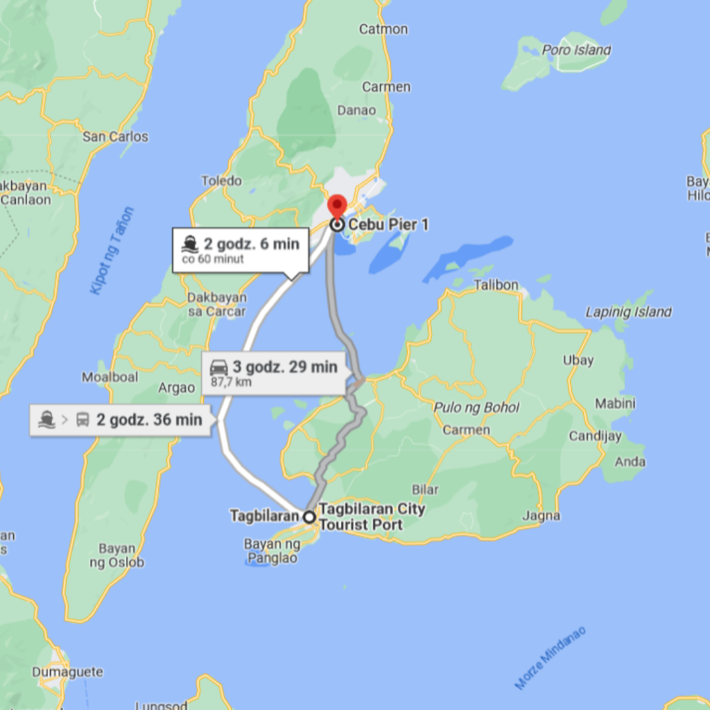 Łódź płynie ok. 2h. A i ważne, żeby dobrze sprawdzić z i do jakiego portu chcemy popłynąć, bo jest kilka różnych możliwości. My płynęliśmy z Cebu Pier 1 do Tagbilaran City Port Terminal.